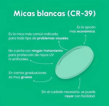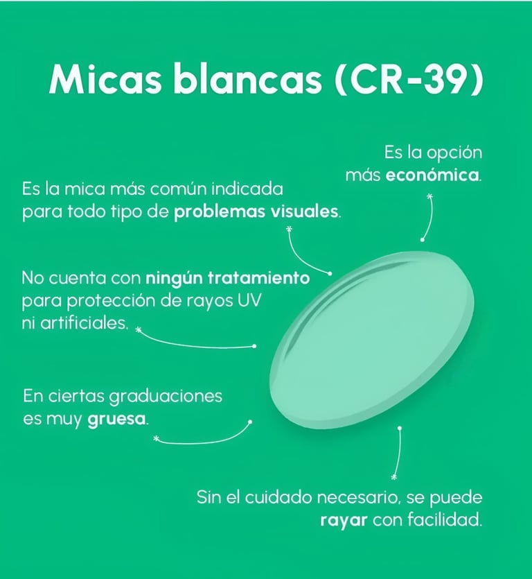 Fabricados con material CR-39, estos lentes ofrecen una excelente calidad óptica con alta transparencia y resistencia a los arañazos. Son ligeros y cómodos, ideales para el uso diario. No cuentan con ningún tratamiento adicional, lo que los convierte en una opción accesible y versátil para quienes buscan una visión clara sin recubrimientos especiales